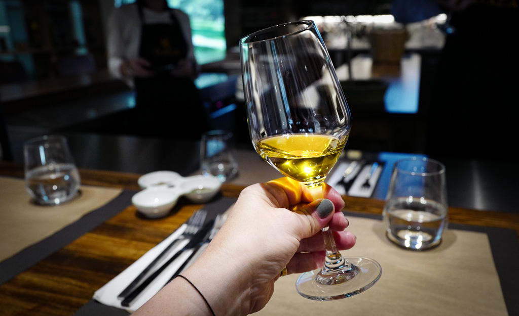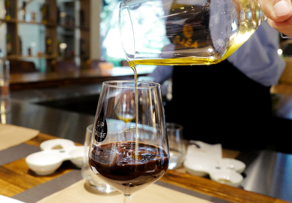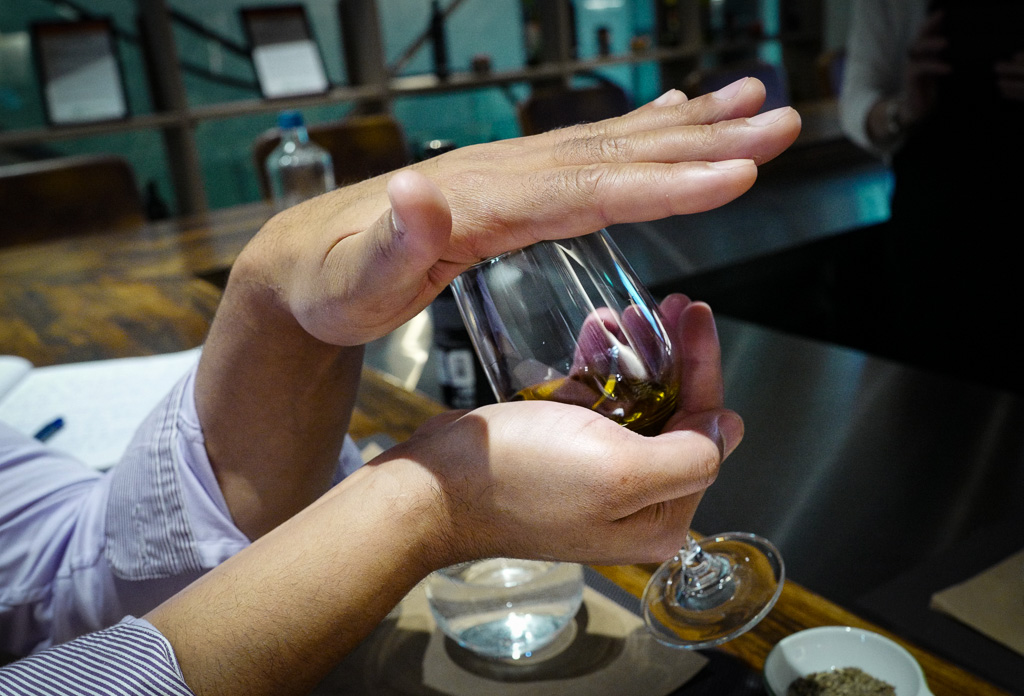 Når du smaker på oljen skal du kjenne bitterhet og krydder (pepper). Slipp inn luft på siden for å kjenne bitterheten. Pust ut gjennom nesen. Dette er som ved vinsmaking.
