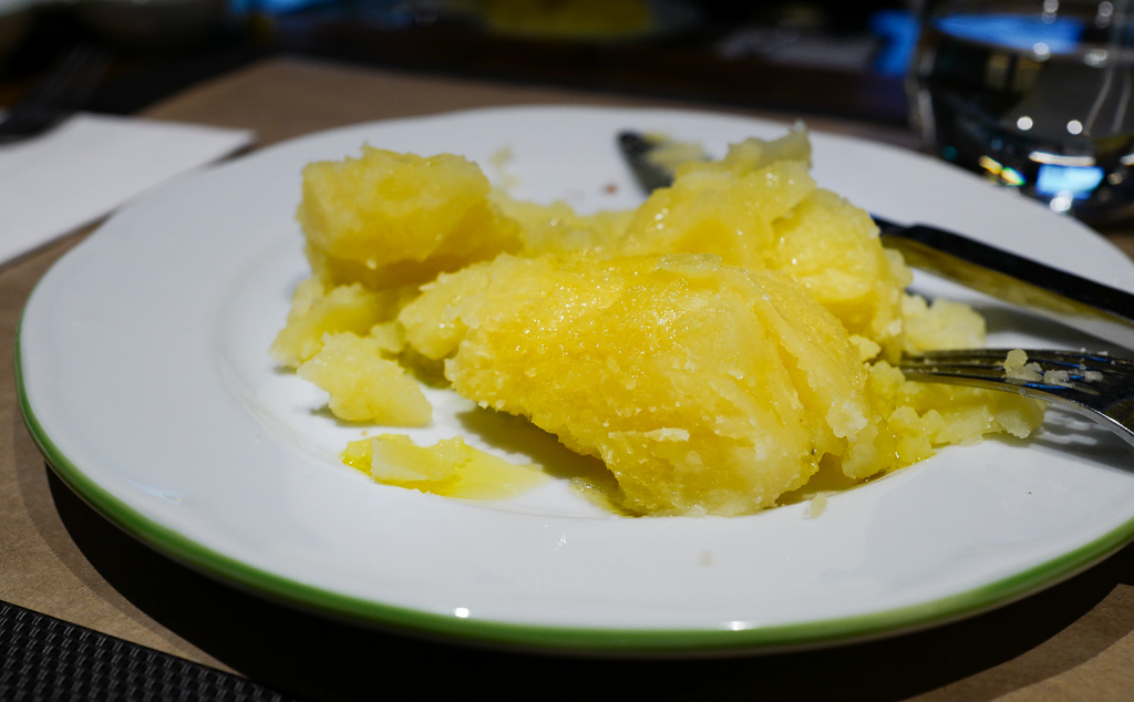 Vi heller rikelige mengder olje over poteten som vi har skrelt og most. Vi drysser litt salt og oregano over poteten og smaker. Bitterheten og peppersmaken er borte. Vi sitter igjen med verdens beste potetmos som ikke fremstår som fet i det hele tatt.