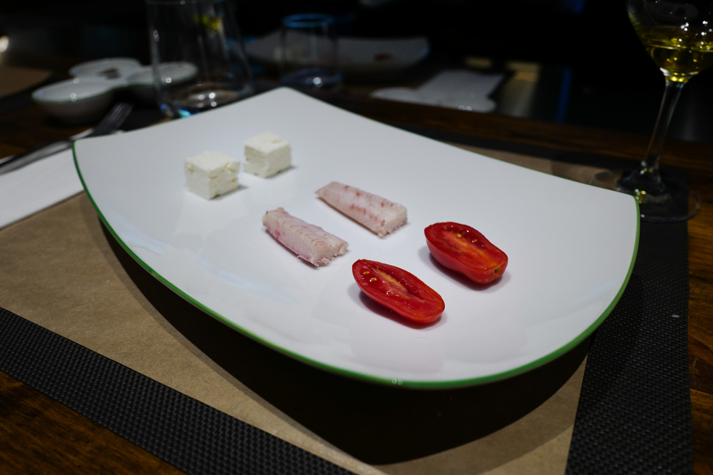 Vi tester extra virgin olivenolje mot andre matvarer: Tomat, røkt fisk og ost. Vi tester med og uten olje. Røyksmaken i fisken forsvinner og saltsmaken kommer frem når vi tilsetter olje. Syrligheten forsvinner når vi spiser tomaten med olje. – Lykopen (som finnes i tomater) må ha olje for å kunne bli tatt opp i kroppen. – Det finnes slike kjemiske forbindelser som man bør vite om, sier Pandelis.