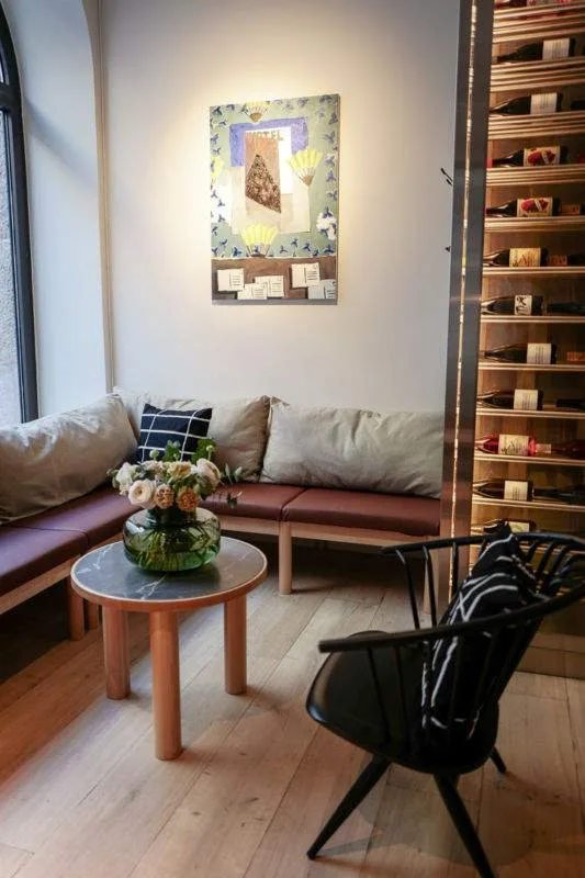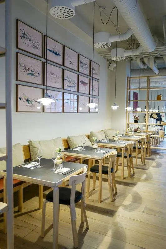 Sushiebar + Wines første restaurant i Oslo velger å ha samme nordiske uttrykket interiørmessig som på restaurantene i Helsinki. Møbler er tegnet av arkitekt Alvar Aalto for Artek. Serviset er laget av Marimekko og Iittala. Lokale kunstnere utsmykker veggene.