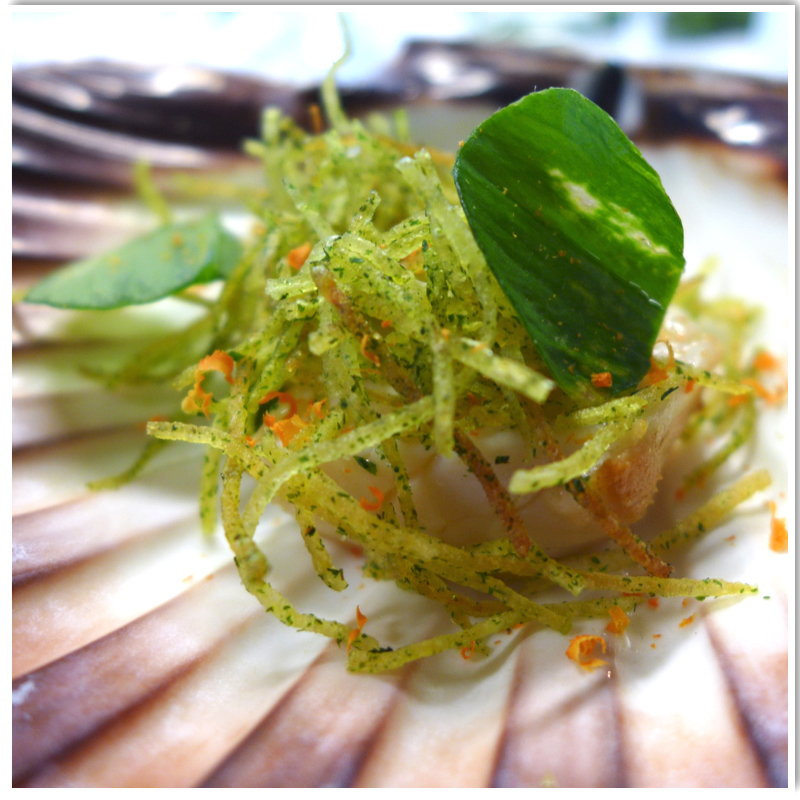 Kamskjellene pensles med litt smeltet smør, så grilles godt på sidene rundt ikke på toppen og bunnen. Avkjøl kamskjellene litt, deles i to på tvers. Dyppes i epleedikk, ta på salt- så anrettes med reven pepperrot, ramsløk, og sprø potet