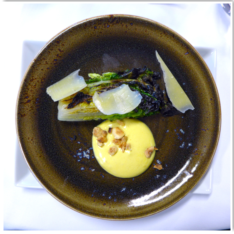Hjertesalaten deles i 2. ha på olje, salt og pepper. Grilles på kullgrill på begge sider til den blir nesten svart. Deles opp i passende biter, ha på fersk sitronsaft.