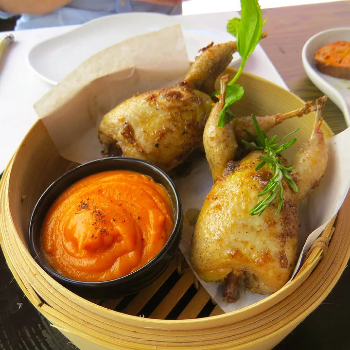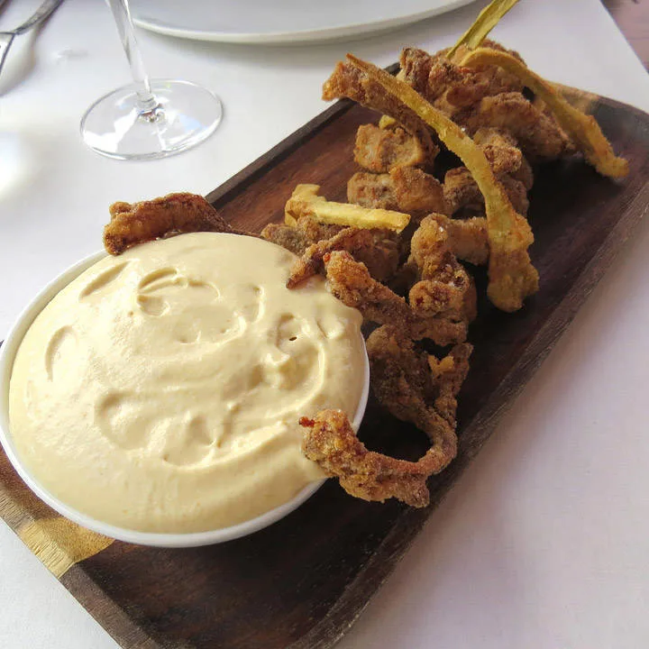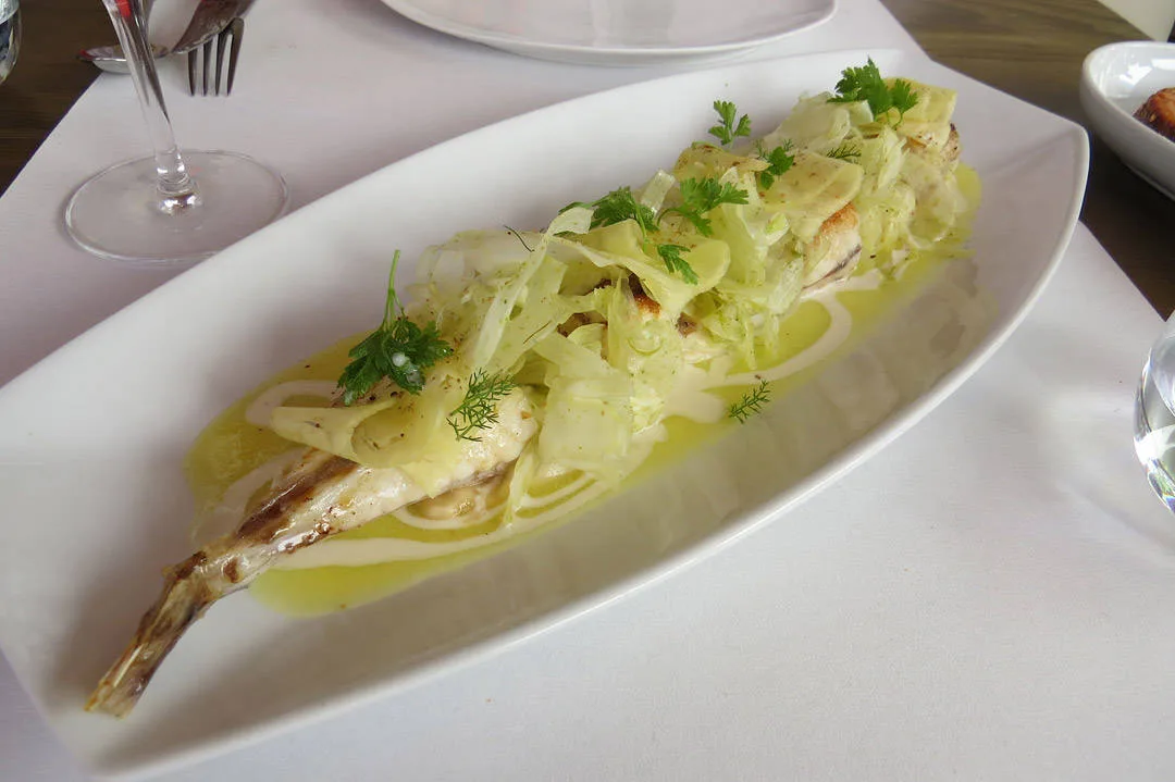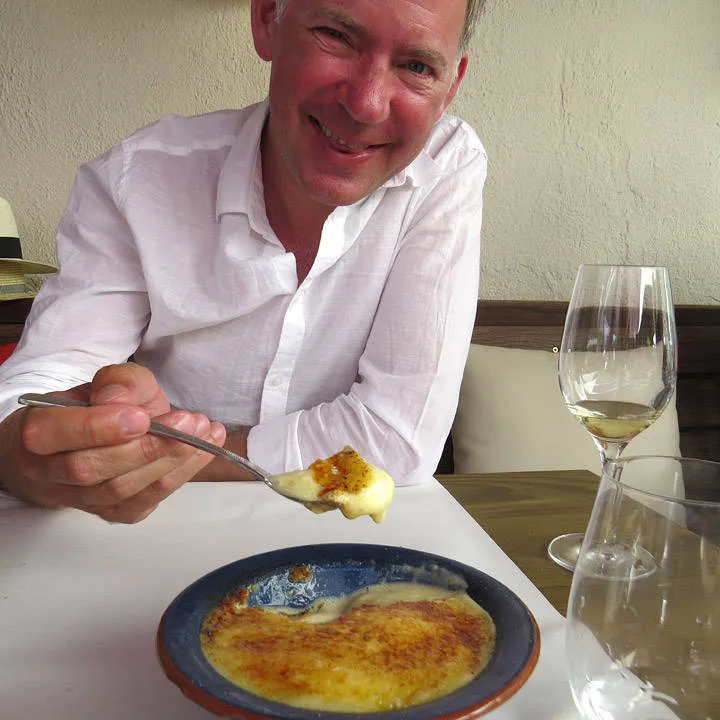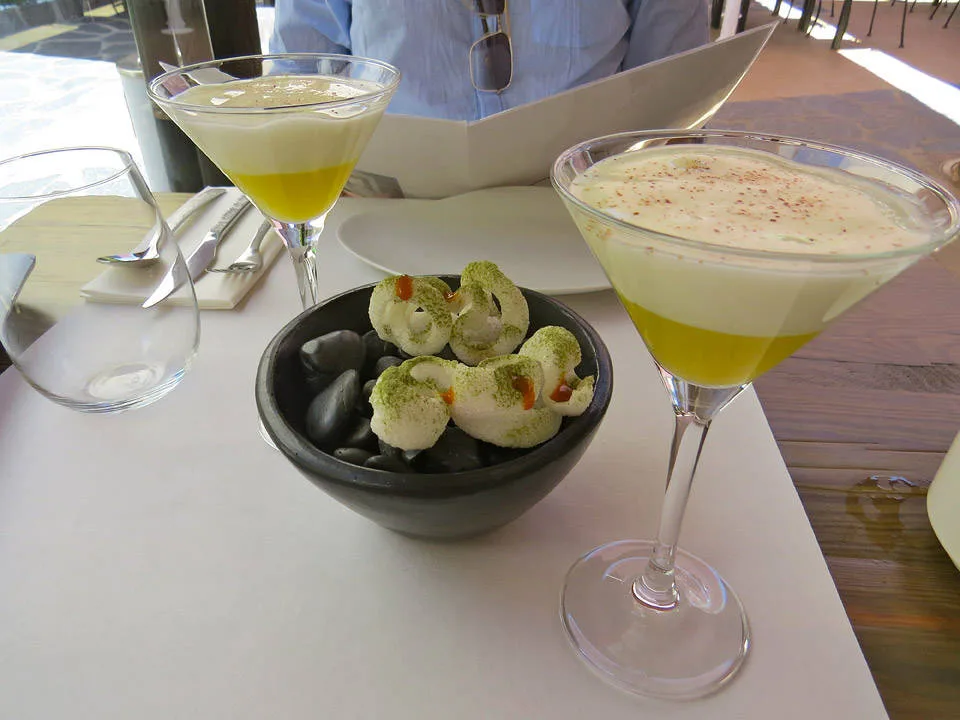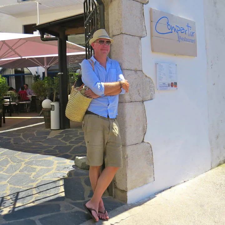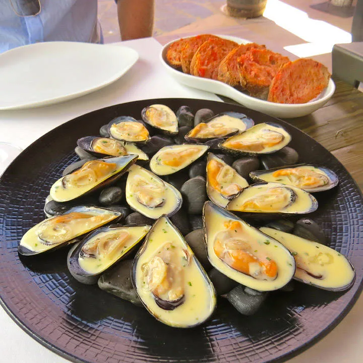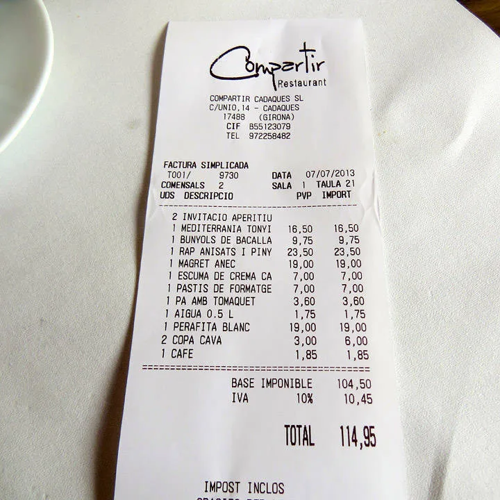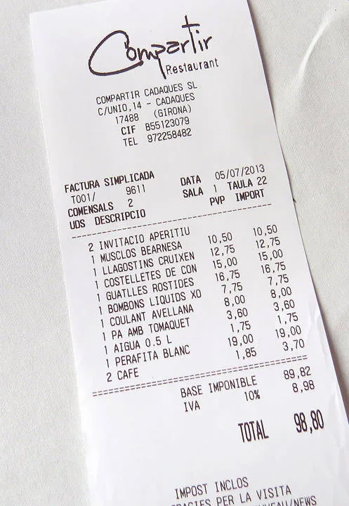 Compartir = å deleVelkomstdrink bestående av eple, calvados og epleskum. Snack laget av ris og algestrø og kimchi.Første rett ut: Blåskjell med bearnaissaus. Helt herlig, og passe harry for en trønder som meg. Utrolig deilig og visuelt vakkert.Kjempereker og asparges tempura med en fluffy molesaus.På vei mot Cadaques kjører du forbi vinmarker. Denne vinen er fra Cadaques og den passer perfekt til denne maten.Kaninribben som er sprøstekt med brødrasp servert med epleailoli og fennikel.For en rett! Perfekt stekte vaktler gnidd inn med kardemomme, servert med en puré av søtpotet og appelsin.Sjokoladekuler med flytende sjokoladefyll servert med solbærsorbet og hasselnøttkrem. En eksplosjon i munnen.Hasselnøttfondant med mangosorbet. Perfekt flytende kjerne.Dette er regningen for meg og Erik. 6 retter + en flaske vin.Ikke dyrt!Fornøyd Erik utenfor inngangen.Herregud, så godt! Dette var det beste vi spiste i hele ferien! Tunfiskrullade middelhavsstil med kapers, tomater, rogn, basilikumolje, tapenade, rømme. Tilbehøret var ristet brød i tynne, tynne skiver.Klippfiskboller med honningskum. Utrolig overraskende og god smakskombinasjon.Breiflabb med tyntskåret fennikel og ananas. Servert med selleri og mandelpotetpuré.Andebryst oriental style. Servert med shitakesopp, sisho, sesam, sjøgress, miso og bønnespirer. Masse smak!Demontert ostekake. Ostekrem, sultaner, frysetørket bringebær, kirsebærsorbet og kakekrummer.Crema Catalana i skumform. Herlige jorbærbiter på bunn. En spennende vri på en gammel klassiker. Her tok vi et glass lokal cava til. Det synes Erik var en god idé.6 retter, 1 flaske vin og to glass cava.Herlige Cadaques.