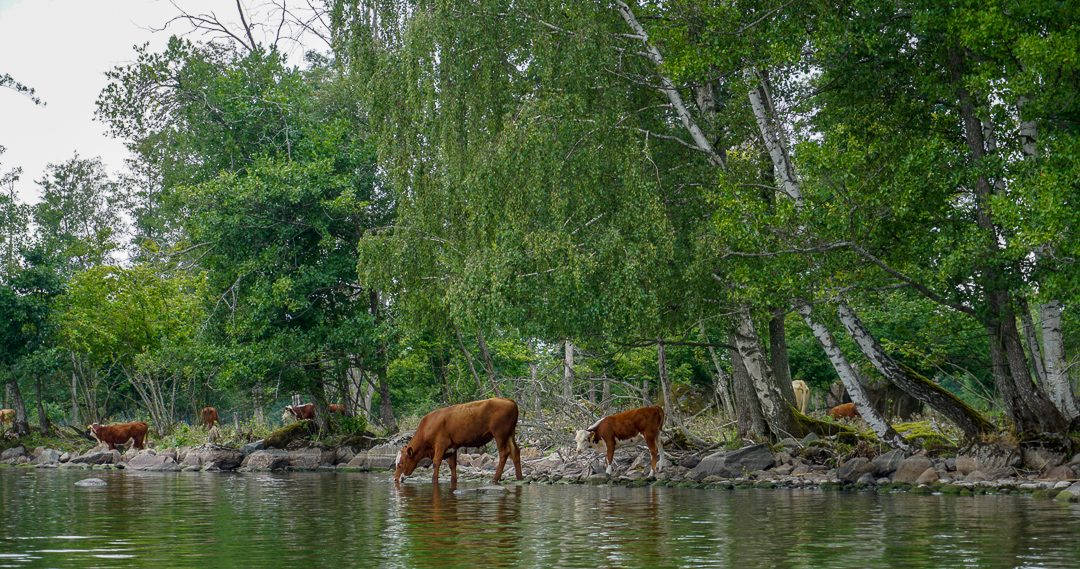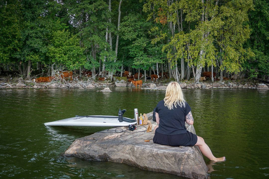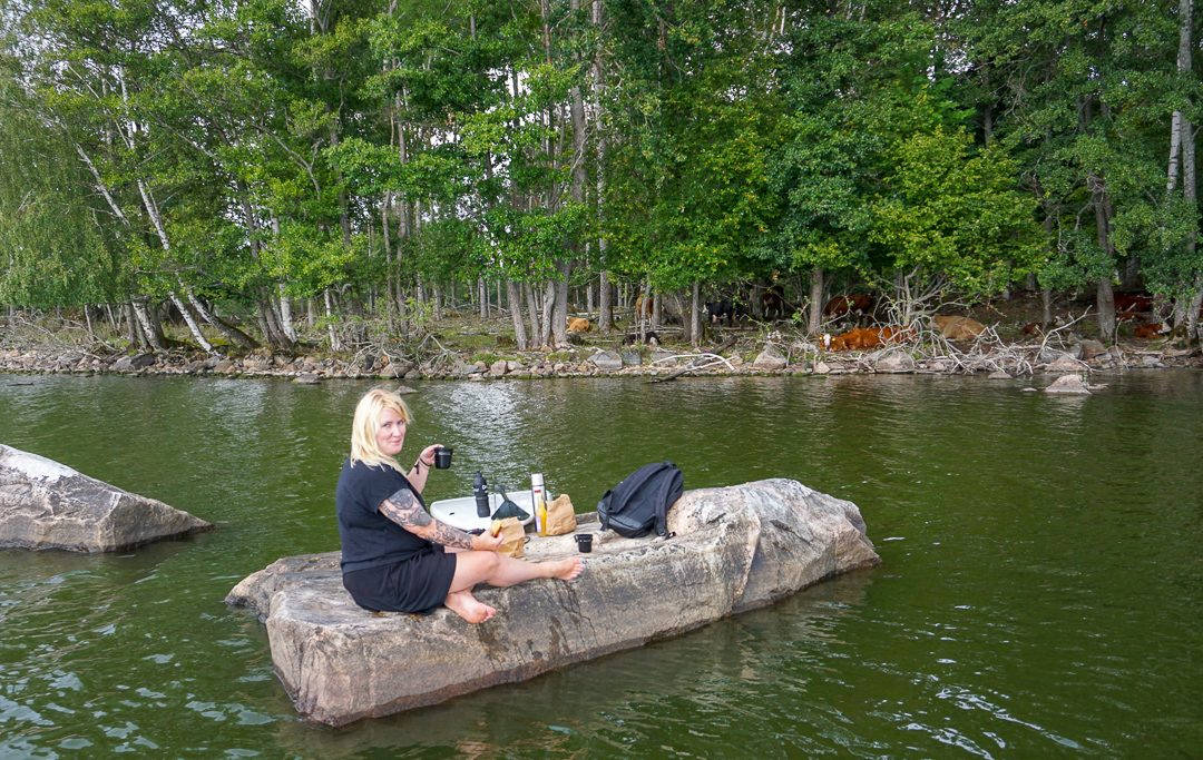Han har kaffe og mat i sekken og vi slår oss ned på den varme stenen. Vi lytter til kuene som gresser på land – kun få meter fra oss. Noen fugler skriker på himmelen. Vannet er blikkstille og vi er helt alene – bortsett fra dyrene rundt oss.