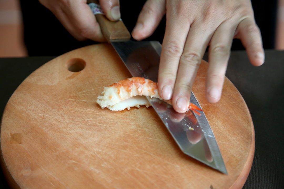- Så legger du på noen strimler svinekjøtt og til slutt en halv reke med utsiden ned mot rispapiret. Rull til en tett pølse. Fold inn sidene og bruk en bit kokt risnuddel til å lime enden på rispapiret slik at du lukker rullen.