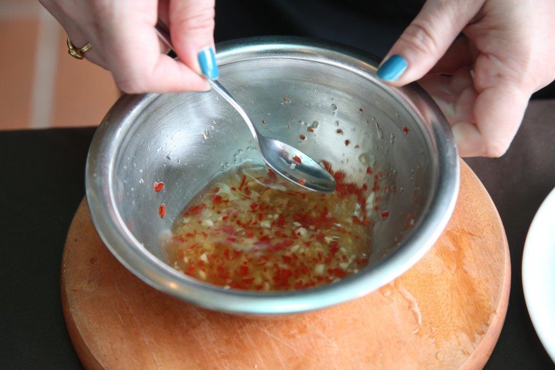 - Dipp: Bland vann, sukker, eddik og fiskesaus slik at sukkeret løser seg opp. Tilsett hvitløk og chili.
