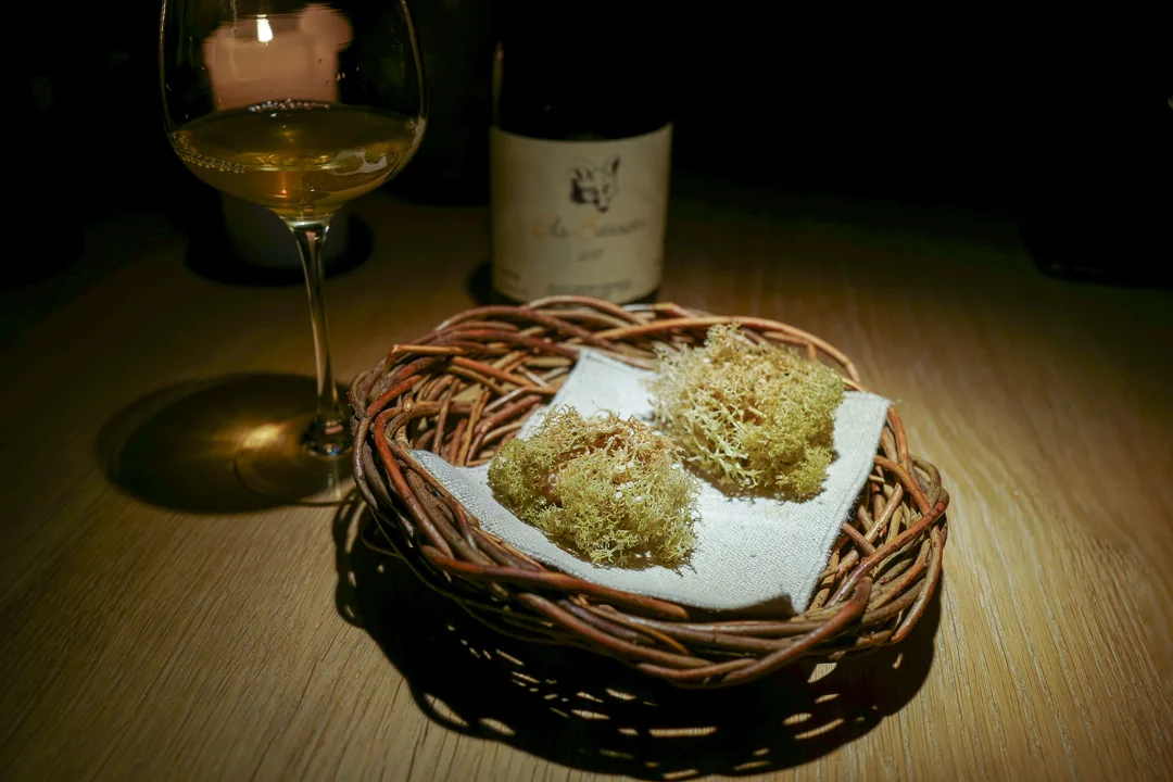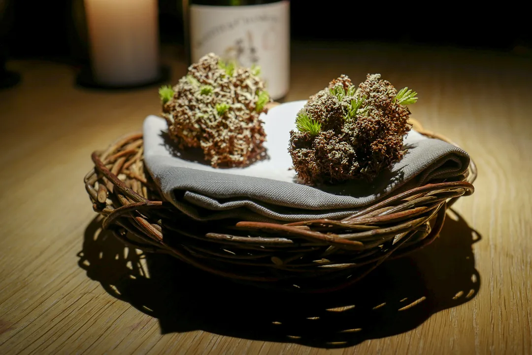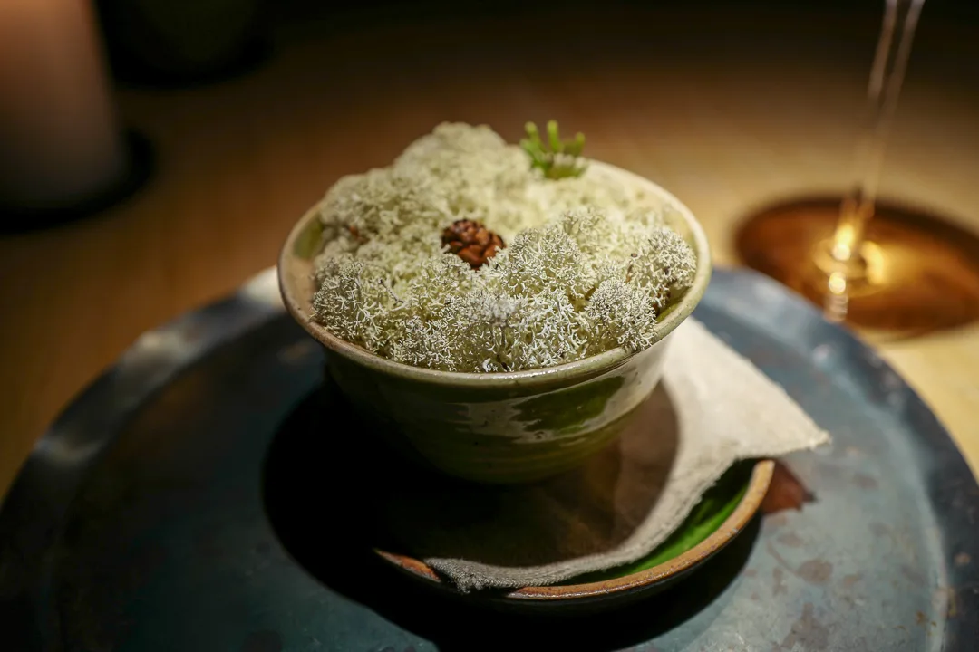 Vi starter slik vi har gjort de to andre sesongene, med en varm suppe. I sjømatsesongen fikk vi et sjøsnegleskjell fylt med deilig kraft. I grønnsakssesongen hadde de kreative kokkene laget en potetsuppe som måtte suges opp fra jorden på en urtepotte. Denne gang skal vi ut på vidda. Det er jo viltsesong, og vi må komme i den rette stemningen. Inn kommer en skål med mose og små kongler. Vi får beskjed om å drikke langs kanten og ikke spise mose eller kongler. Det får vi mulighet til senere blir vi fortalt.