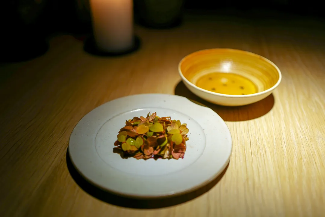 Neste rett er en av favorittene. Nyperose fylt med japansk kvede og rose på det ene fatet. Syltet plomme fra i fjor fylt med en paste laget av solsikkefrø og rabarbra og litt røkt persille på et annet fat. Dette er en versjon av sommerens «fylte vinblader». Serveringen er så vakker og naken. Den syltede plommen fungerer som et skall for fyllet og smakene er kjøttaktige og mektige.