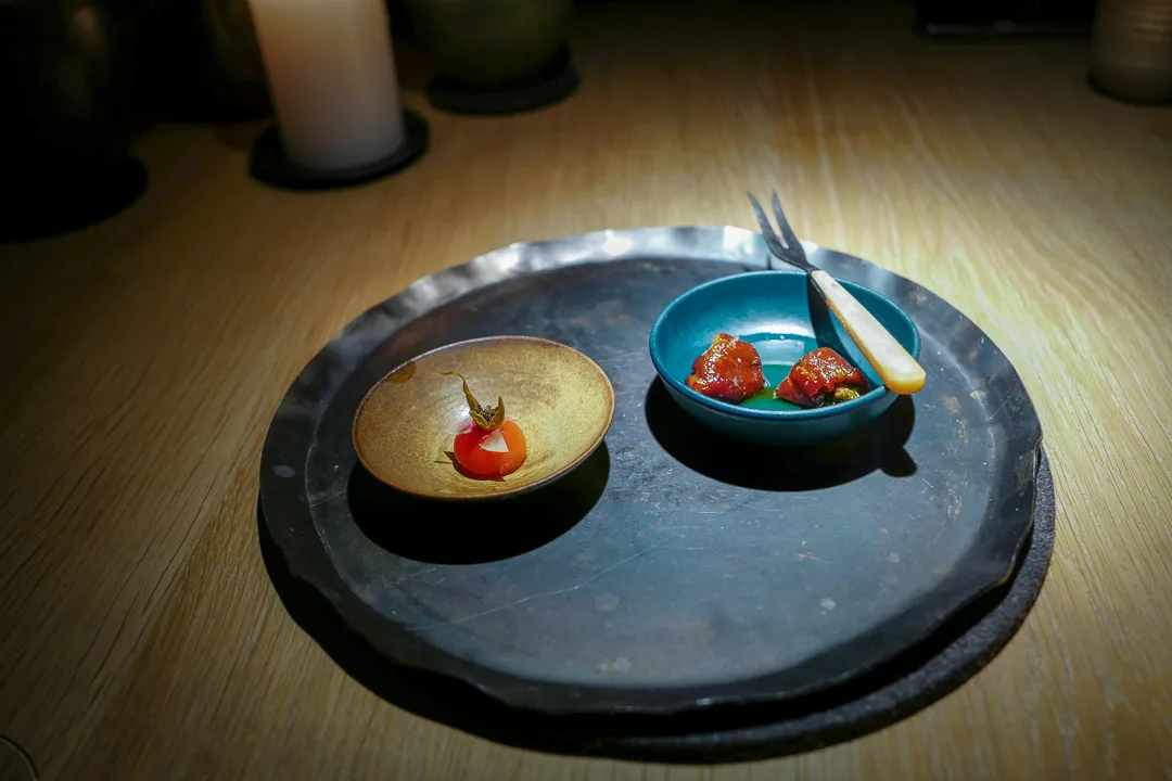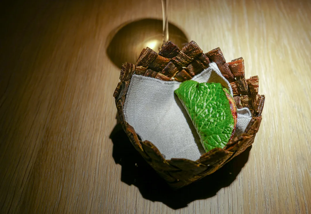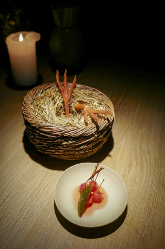 Vi får tartar av reinsdyrhjerte med et lass gjøksyre på toppen. I en skål ved siden av ligger en sammenpisket, røkt eggeplomme med maur på toppen. Langs kanten på skålen er det penslet med en blanding av tang- og tare-paste for å gi salt til retten. Mauren gir syre til eggeplommen.