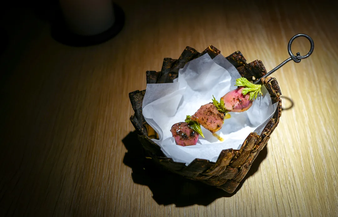 Grillspydet kommer i en nordisk neverkurv. Konsistensen på kjøttet er ganske fast, men smaken er fenomenal. Et subtilt hint av chili gjør retten perfekt for oss.