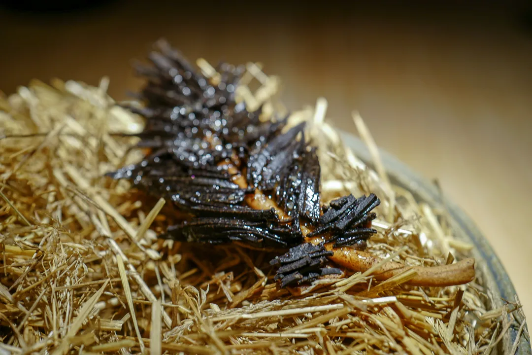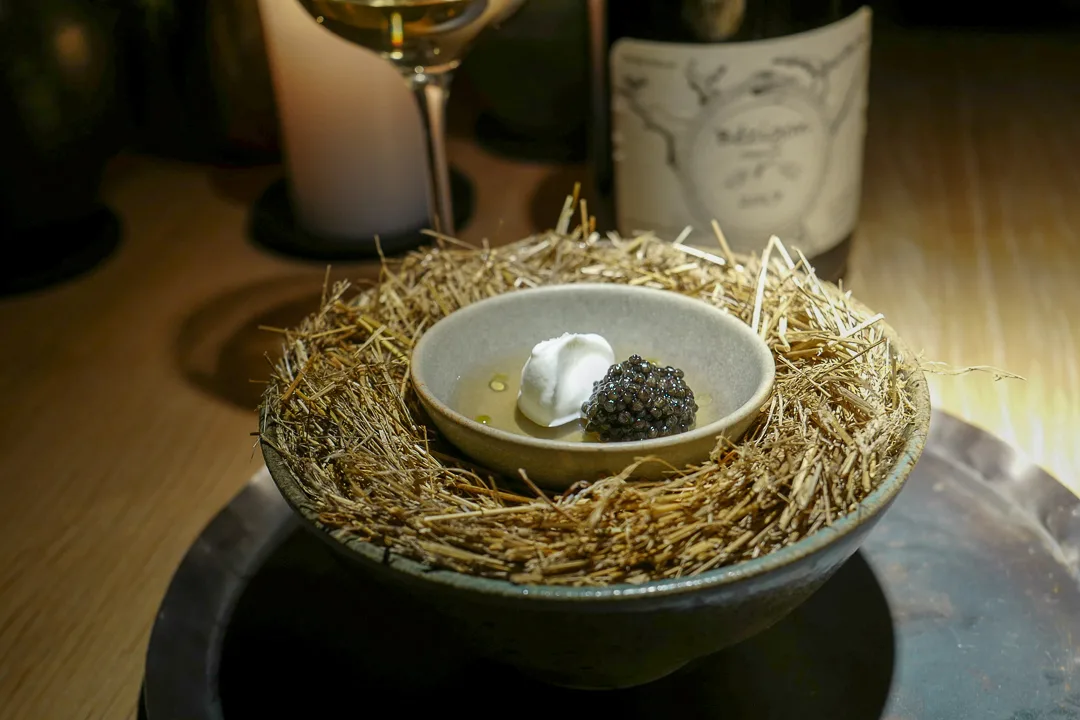 Fjæren: Inn kommer den vakreste presentasjonen du kan tenke deg. Det ligger en sort «fjær» på en seng av høy. Fjæren er et flatbrød laget med malt og øl, dekket med koji og dekorert med små trøffelstaver. Det er nesten for galt å spise den. Det lukter trøffel lang vei, og det er aldri feil.