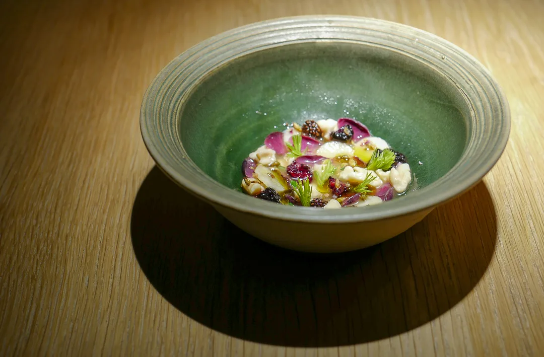 Sesongens ceviche-variant er så lekker presentert med tørkede solbær, rå valnøtter, ferske korianderfrø, syltede minikongler, eple og kraft laget av mirabelle-plommer.