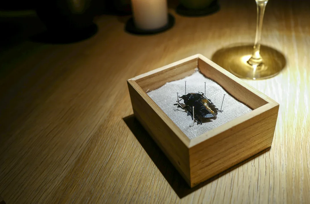 Billen i boksen. Vi løfter opp lokket og en vakker «utstoppet» bille åpenbarer seg. Den er festet med nåler på en plate som hos en insektssamler.