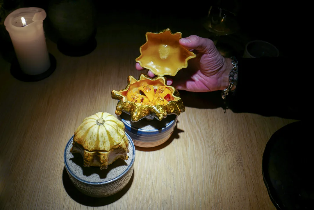 Neste rett presenteres i små, vakre gresskar som er kledd på innsiden med bivoks. Denne teknikken har også gått igjen i tre forskjellige versjoner de siste tre sesongene. Denne varianten består av remser av langkokt gresskar (en slags grønnsakstagliatelle) med morkler bakt i bipollen. Den er ganske spicy med et deilig dryss nøtter og selvsagt mye smør. Retten er hverken kald eller varm, og jeg vet ikke om det er den beste måten å servere den på. Jeg er ærlig talt ikke så begeistret for pollen. Jeg synes det var for mye av det i forrige sesong og denne gangen får jeg også et lag med voksaktig støv i ganen som ikke gagner retten.