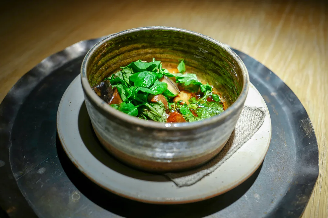 «Hot pot» med syltet sopp og urter og saus laget med sort trøffel kommer til bordet. En skikkelig umamifest. Det syder og koker og igjen får jeg veldig flashback til min mormors matlaging og hennes legendariske kyllligstek med fløte og persille.