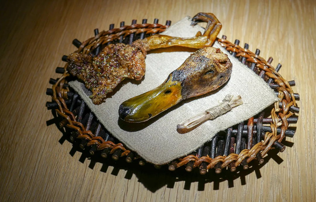 Neste rett byr på utfordringer. Vi vet den skal komme. Det er andehodet med hjernen som popper frem fra kraniet. Hjernen skal spises med en skje laget av tungebeinet på anden. Ved siden av ligger en slags chicharrón laget av skinnet av andelåret krydret med arktisk timian.
