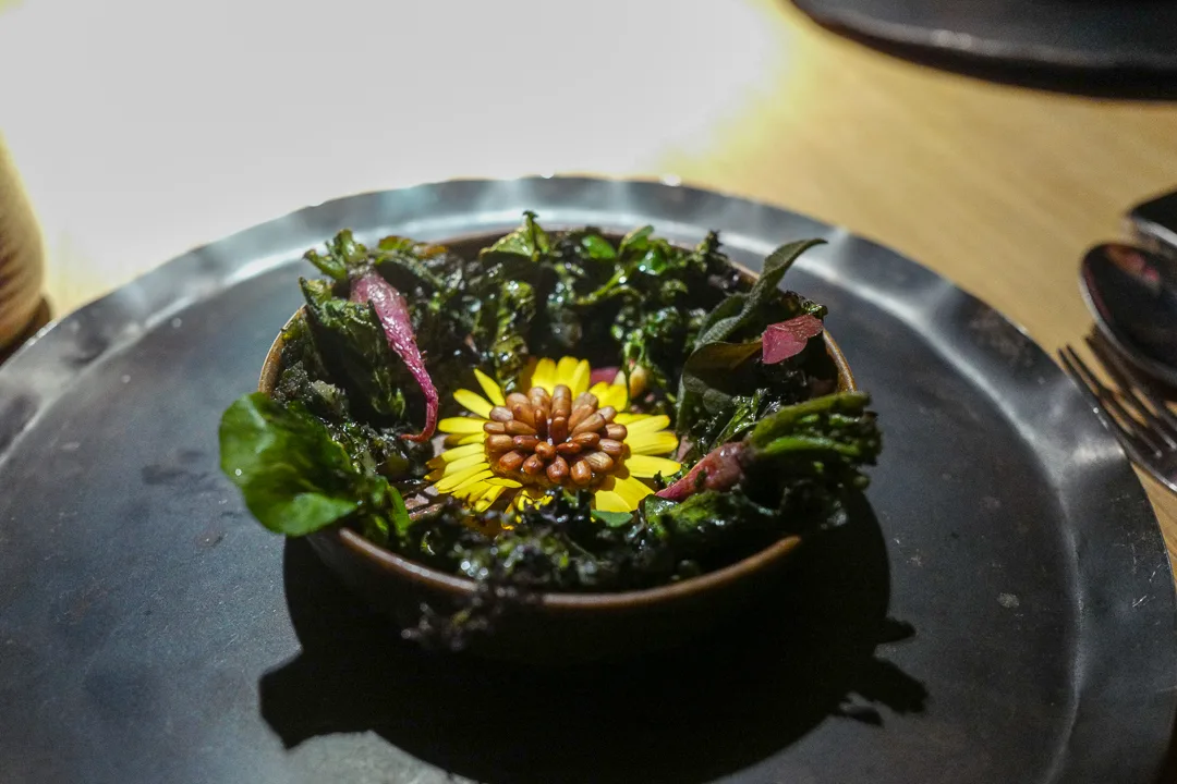 Grillet salat med solsikkekjerner og -blomster, med en karamell i bunnen og saus laget på valle og gjær. Men jeg skjønner ikke retten. Den er et slags intermezzo i kjøttserveringen, men det blir for mye mat. Jeg vet at det kommer en kjøttrett til, som attpåtil er kraftig, og da blir en slik rett for mye, uansett hvor vakker den er å se på.