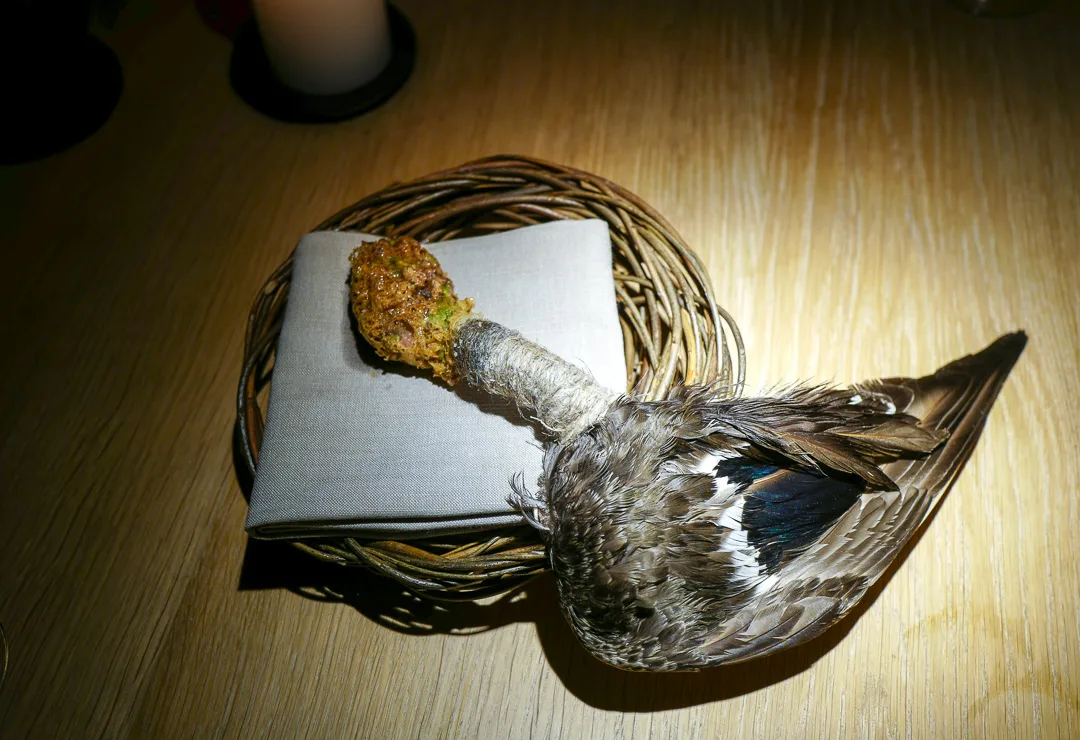 Andehjernen kunne ha vært servert på en annen måte uten andehodet og det hadde ikke vært spektakulært. Det er klart Noma er ute etter å sjokkere nok til å få Instagram til å koke.