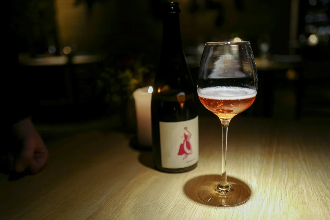 Sommelier Mads Kleppe skjenker nydelig musserende i glasset. 2015 Bulles De Comptoir fra Charles Dufour.
