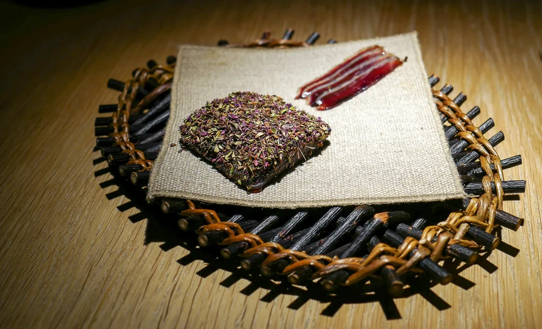 Vi får tartar av reinsdyrhjerte med et lass gjøksyre på toppen. I en skål ved siden av ligger en sammenpisket, røkt eggeplomme med maur på toppen. Langs kanten på skålen er det penslet med en blanding av tang- og tare-paste for å gi salt til retten. Mauren gir syre til eggeplommen.
