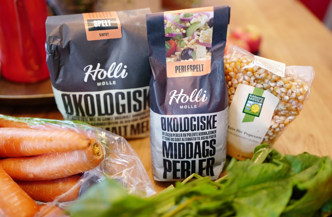 • Økologisk siktet speltmel og middagsperler fra Holli Mølle