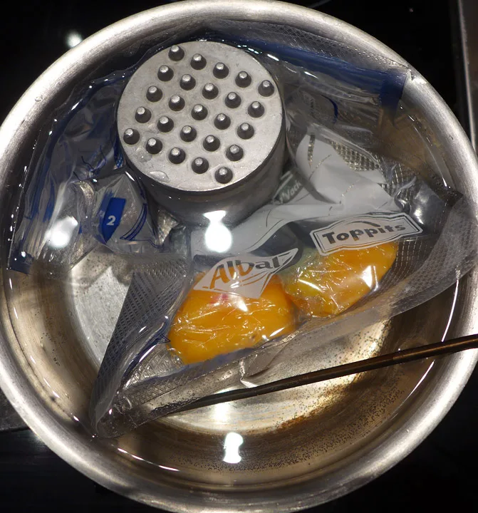 Først startet jeg med eggeplommene. De skal bli kremete i konsistensen, og da må jeg legge dem i et vannbad som holder 62 grader. Det gjør jeg enkelt ved å pakke eggeplommene inn i plastfolie som jeg har smurt med nøytral olje. Jeg lukker plasten med en strikk. Beregn 1 stort eller to små per pers. Legg alle små pakkene i en tett pose (zip lock er bra) der du presser ut mest mulig luft uten at plommene går i stykker.