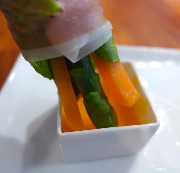 Vårrullene: Skjær tynne strimler av gulrot og agurk. Damp asparges. Kjøl dem ned når de er ferdige. I en bolle lager du en enkel vinaigrette av sennep, salt, sitronsaft og olivenolje. La grønnsakene lynsylte i vinaigretten i 15 minutter.