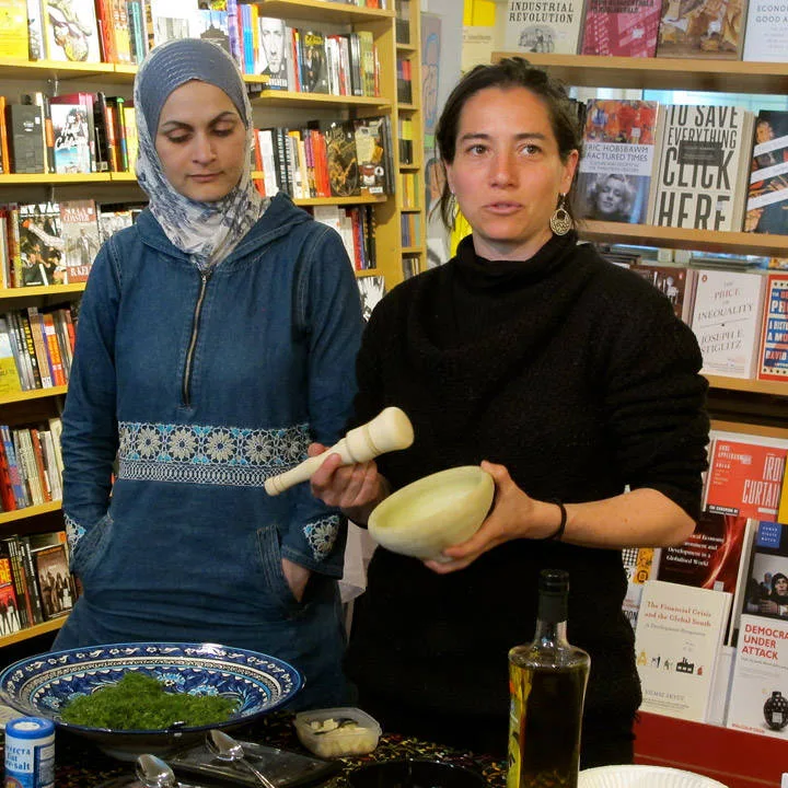 Laila El-Haddad og Maggie Schmitt forteller om lettelsen og engasjementet lokalbefolkningen føler når de blir spurt om annet enn krig, bomber og uro. Praten går livlig når temaet mat kommer opp.