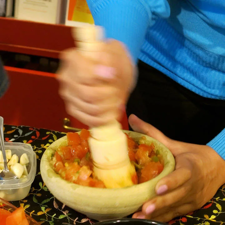 Så grovhakker du 2 modne tomater og støter dem lett i morteren.