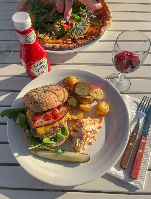 Selve burgeren var litt vel karbonade-aktig, men tilbehøret var veldig godt. Pizzaen var et stort hopp opp fra i fjor.