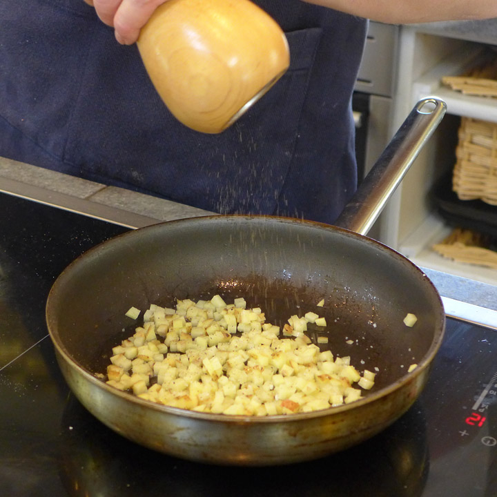 Skrell poteten og skjær den i bitte-bittesmå terninger. Stek i olivenolje i en panne til de er møre og gylne. Det tar ikke mange minuttene når bitene er små nok.Pepre og salte lett.