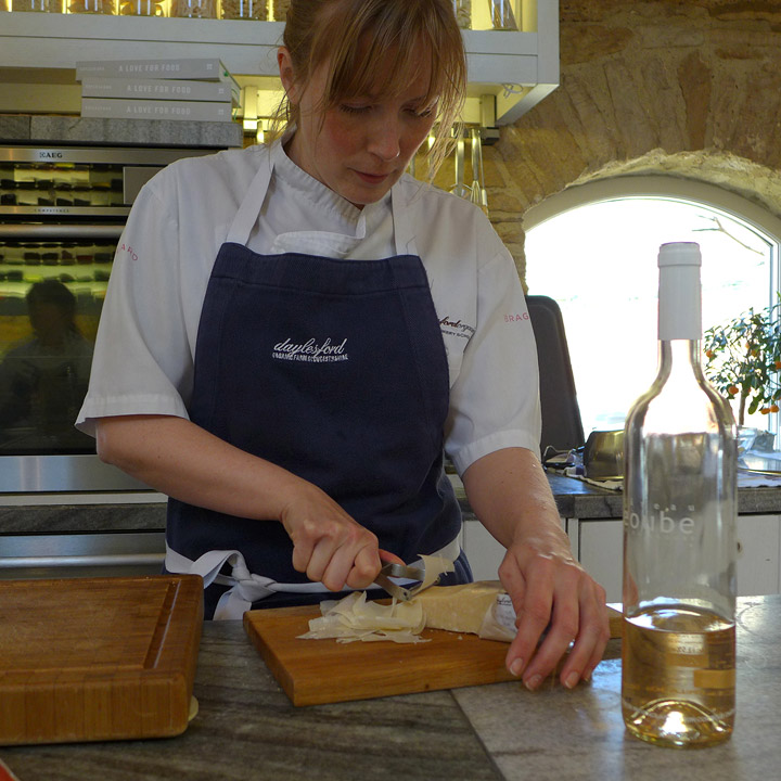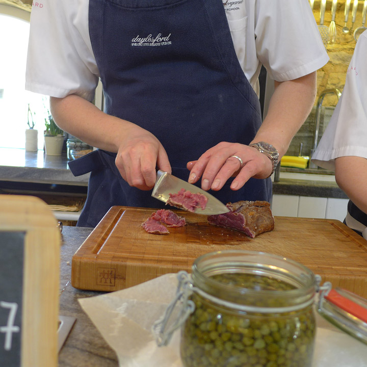 På matkurset jeg deltok i Cotswold (to timer med bil utenfor England) lærte jeg denne kule retten. Alle kjenner til carpaccio? Det er en rett med tynne skiver rått oksekjøtt. På Daylesford (der jeg gikk på matkurs) stekte de kjøttet kjapt i pannen på høy varme. Dette fordi kjøttet beholder sin deilige struktur. Tradisjonell carpaccio lages ved å fryse kjøttet slik at det er letterer å skjære tynt. Hos Daylesford mener de at dette gir vann i musklene og gir et vassent resultat. Dessuten vil du bli kvitt evt bakterier i kjøttet ved å steke det kjapt. For bakteriene ligger kun på utsiden av kjøttet.