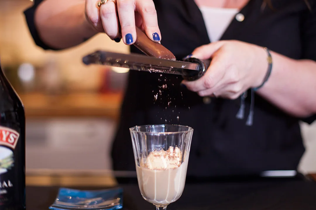 Ha iskulen over i et milkshakeglass. Hell over Baileys. Ved servering helles varm espresso over og til slutt rives iskaldt marsipanbrød over. Ha gjerne marsipanbrødet i fryseren en time før servering. Det gjør det lettere å rive marsipanen over desserten.