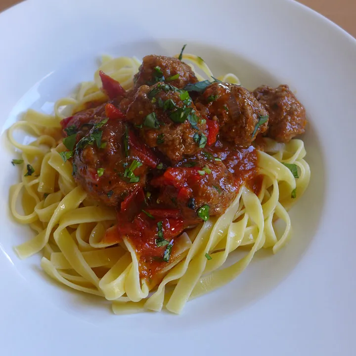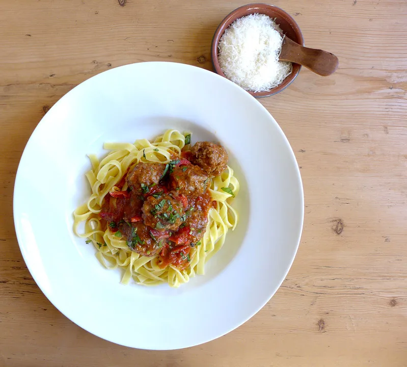 Jeg kokte båndpasta al dente (med litt tyggemotstand), silte av vannet og serverte den med kjøttboller i tomatsaus, litt god olivenolje på toppen og en generøs skje parmesanost. Et dryss hakket basilikum må med. Det blir vel egentlig ikke bedre, gjør det vel?