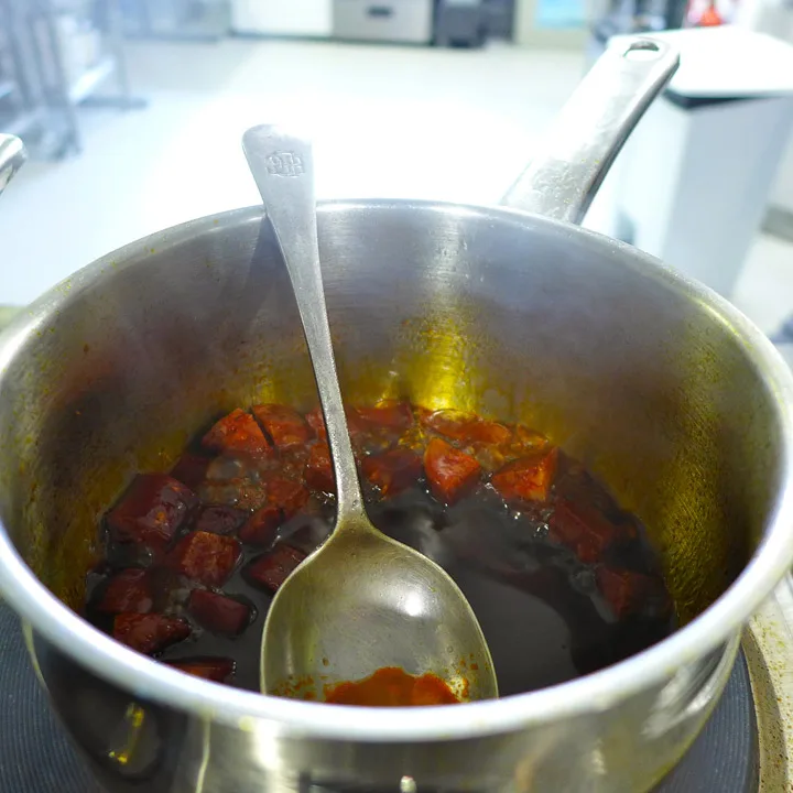 For chorizo-reduksjonen – Ha biter av chorizo i en varm panne . Når oljer begynner å sive ut av pølsen , tilsetter du 1/2 glass rødvin og 1 ss honning . Forsiktig redusere vinen til du sitter igjen med en klissete glasur .