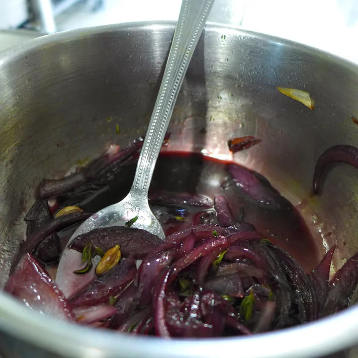 Løkmarmeladen – varm litt rapsolje i en stekepanne og tilsett løken og rosmarin, samt et par kardemommekapsler . Surr til løken begynner å mykne. Tilsett sukker og la detl karamelliseres litt , før du dekker med rødvin . La dette deretter småkoke til det er redusert til en litt klissete konsistens .