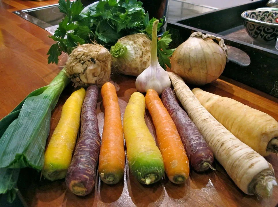 Start med å skrelle og rense grønnsakene. Du trenger en haug med gulrøtter, en purre, en løk, persillerot, sellerirot og pastinakk. Kutt 1/3 av alle grønnsakene ganske smått. De skal smelte inn i gryten. Resten skjærer du i større biter og tilsetter retten når det er en time igjen til servering. Skrell gjerne en stor neve små sjalottløk og tilsett hele når det er en time igjen til servering.