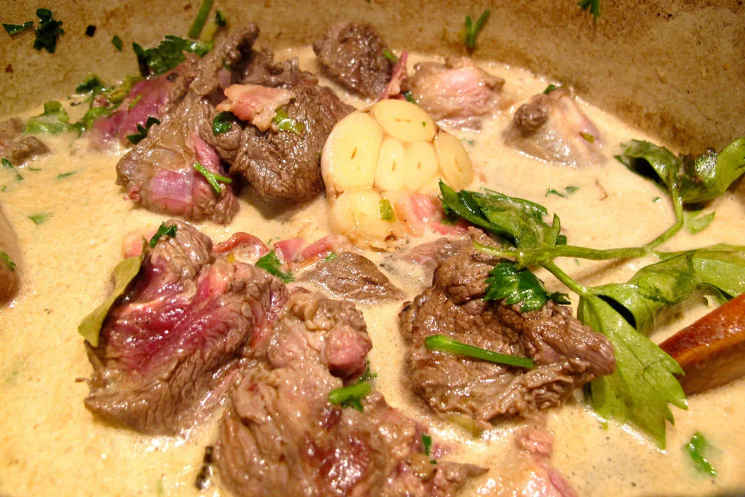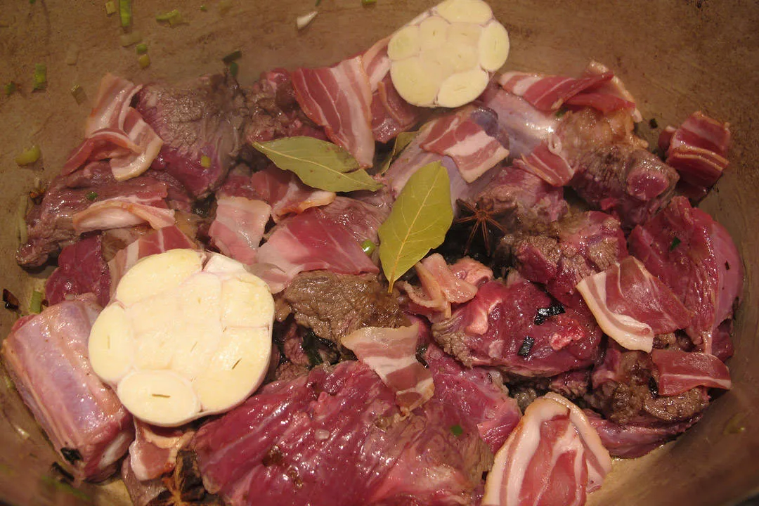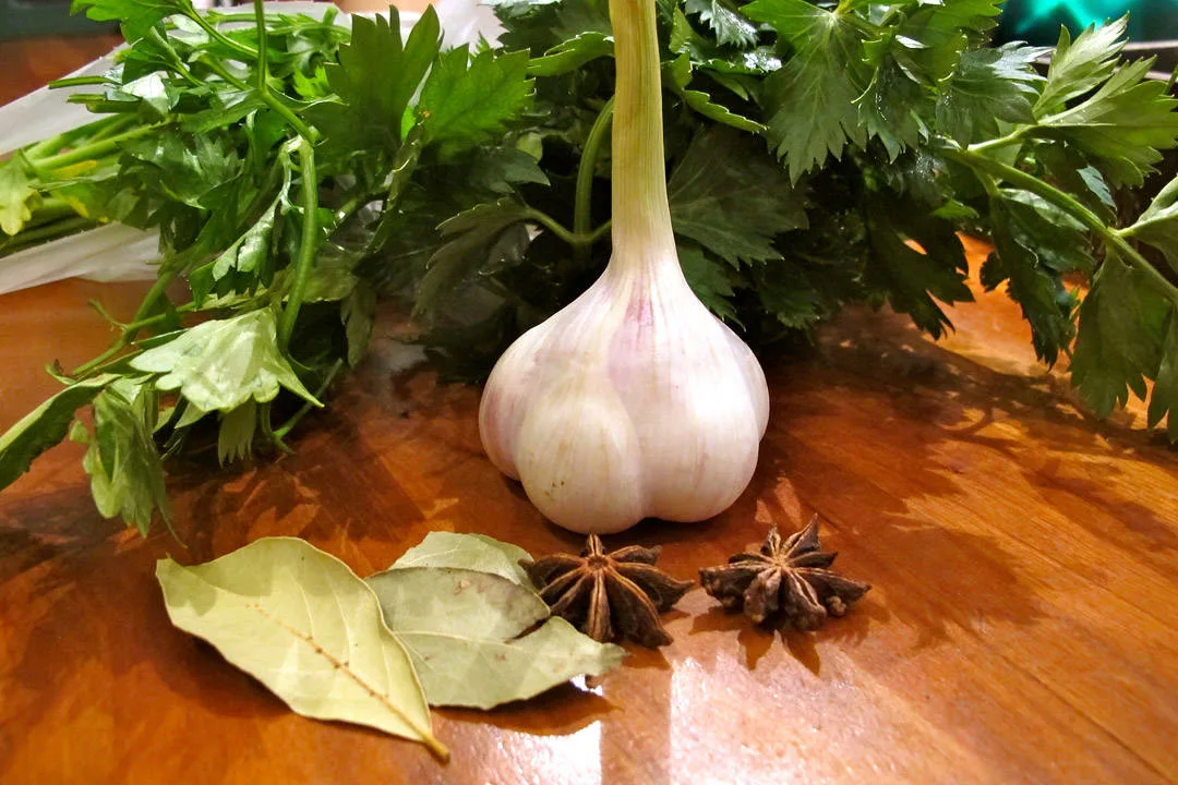 Del hvitløken i to og legg i den ene halvdelen. Den andre delen legger du i gryten sammen de andre grønnsakene når det gjenstår en time av koketiden. Tilsett salt, pepper, stjerneanis og laurbærblader fra starten av, sammen en neve grovhakket selleriblader og flatpersille.