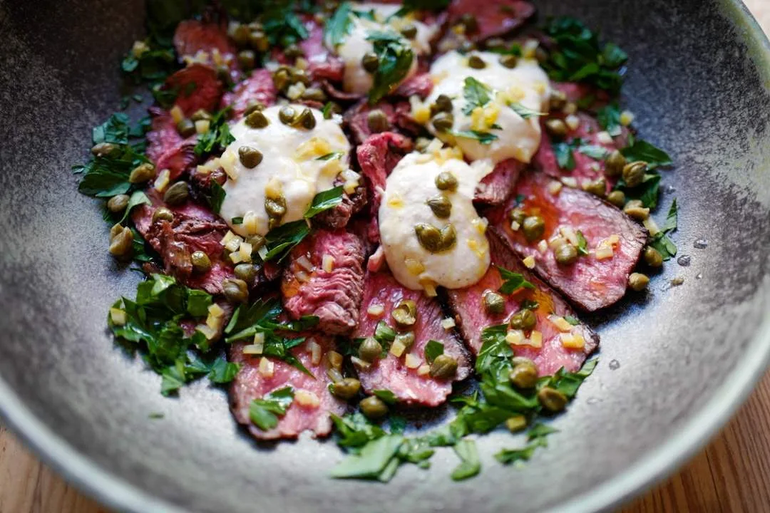 Det er ingen vitello tonnato. Stemmer. Det er ikke det, men smaken er lik. Kanskje vi heller må kalle den barbabietola tonnato, da barbabietola betyr …