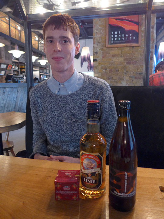 Jeg har med en flaske akevitt, brunost og en flaske øl fra en småskalaprodusent. Øl fra Nøgne Ø er foreløpig den eneste norske drikken du kan kjøpe i baren, men snart drar de til Norge for å håndplukke flere norske produkter.