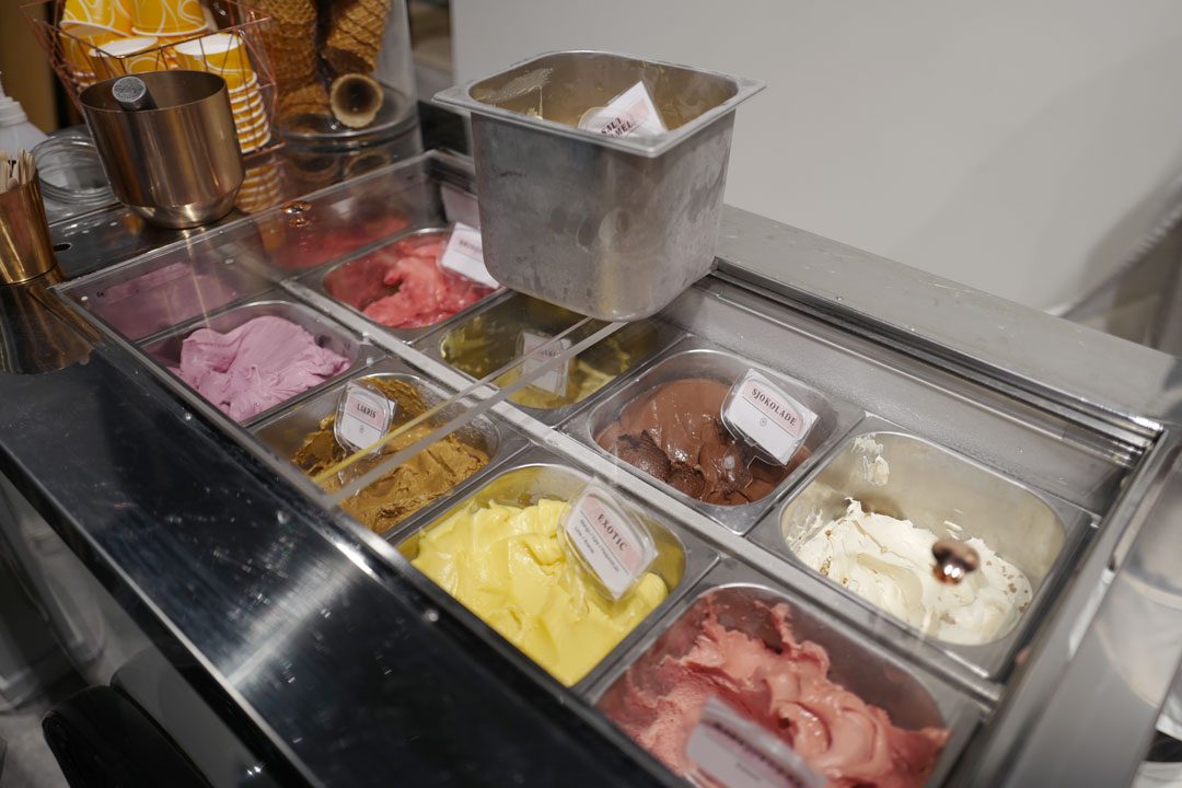 Vel inne i sjappa får vi smake oss gjennom hele sortementet av is fra vognen. Salt karamell, sjokoladeis laget på valrhona-sjokolade, villbjørnebær, lucuma (sør-amerikansk frukt) og mye mer. De har også en sukkerfri variant laget på markjordbær. Hva skal man velge?