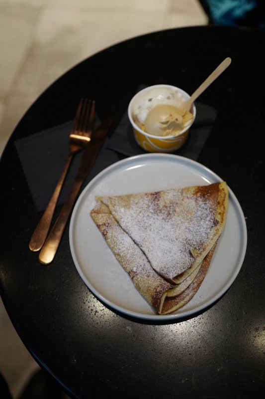 Etter å ha blitt fristet av is og pannekaker på deres facebookside i lang tid tok jeg med meg Erik og gikk rundt hjørnet. Vi skulle fader meg ha iskrem … og crêpes! Ja, for Pierre lager ekte franske pannekaker. Du kan få søte eller salte varianter.