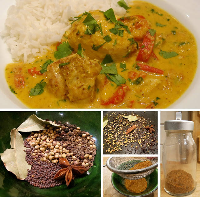 Disse krydderene varmes så vidt i en tørr panne. Sennepsfrøene begynner å poppe, så pass på at du ikke brenner deg. Knus krydderene i en morter og tilsett: