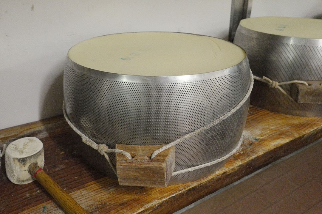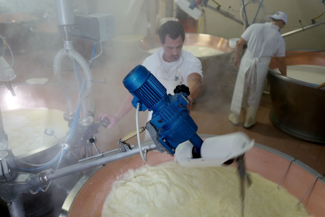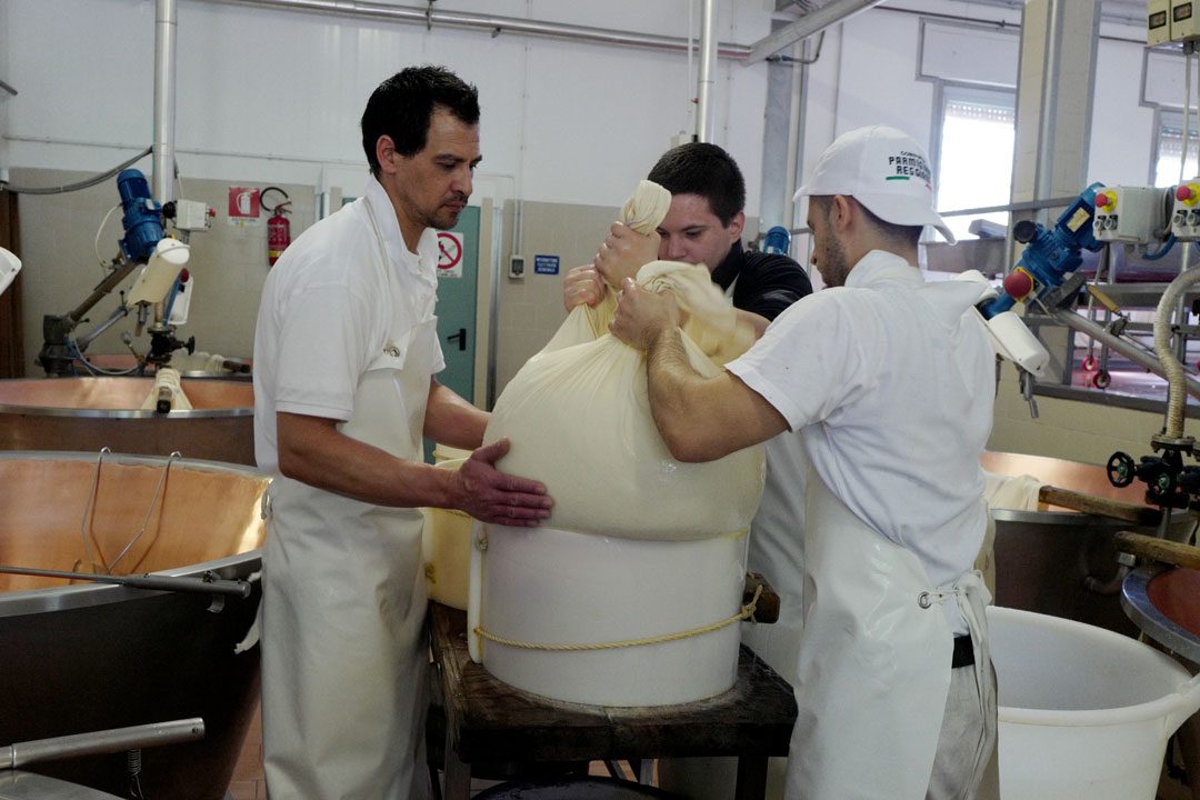 Mejeriet har syv kobberkar på rad og rekke. Hver og et rommer 1100 liter melk. I hvert kar får man to hjul med Parmigiano-Reggiano per dag. Ostemassen heves opp fra væsken og deles i to. Disse ”tvillingene” legges i hver sin form.