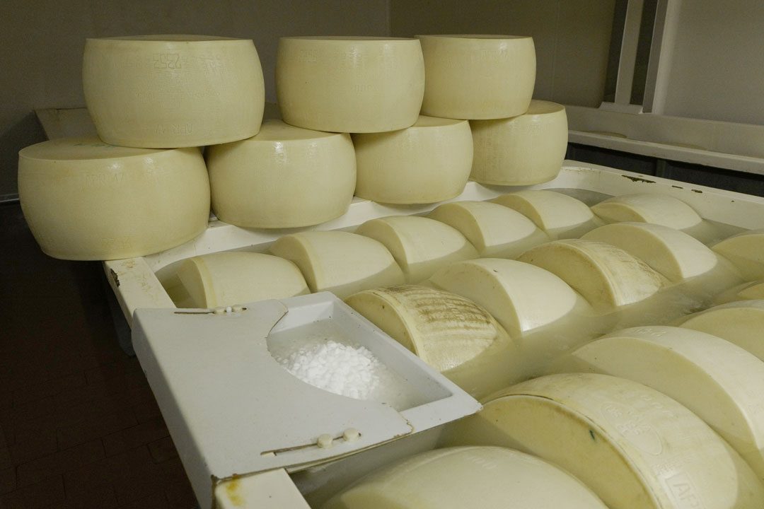 Så legges den i et saltkar og gjennomgår en prosess som heter Osmose. Det tar 22-23 dager før vannet trekkes ut av osten og det dannes en hinne. Da ligge saltet 3 cm fra skorpen og inn i osten. Det tar nye 12 måneder før saltet trenger helt inn i ostekjernen.
