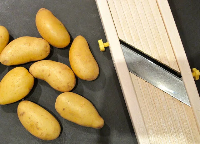 Jeg bruker en mandolin for å få tynne skiver, men du kan bruke en osthøvl eller siden på et rivhjern. Pass fingrene…