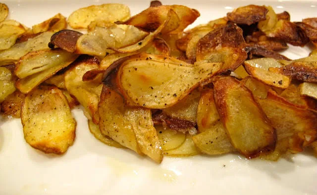 | Spre potetskivene utover en bakeplate med bakepapir på. Så krydrer du med det krydderet du ønsker. Ikke overdriv, for skivene er tynne og trenger ikke så mye krydder per skive. Dryss litt olivenolje over. Stek i ovnen på ca 200 g. Underveis kan du sjekke hvordan det går med dem. Kanskje må du løfte litt på skivene og la noen av de som ligger nederst få lov til å få litt farge. Ta ut før de blir for mørke. Server til kjøtt, fisk eller bare for seg selv. |
