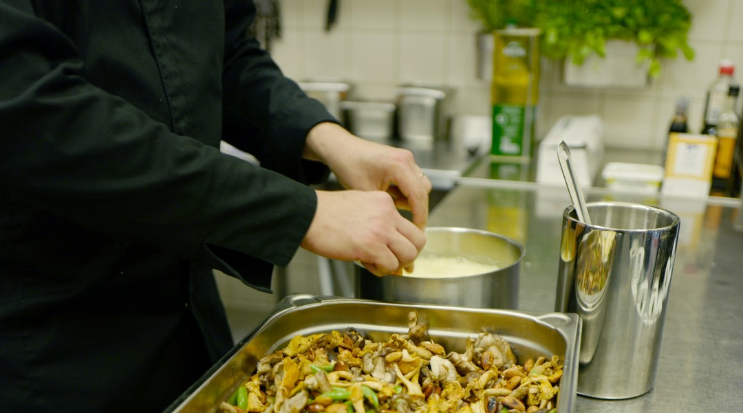 Han står og skummer brunet smør som han skal helle over en blanding av stekte kantareller, haricot verts, ristede mandler, hvitløk og tørkede aprikoser.