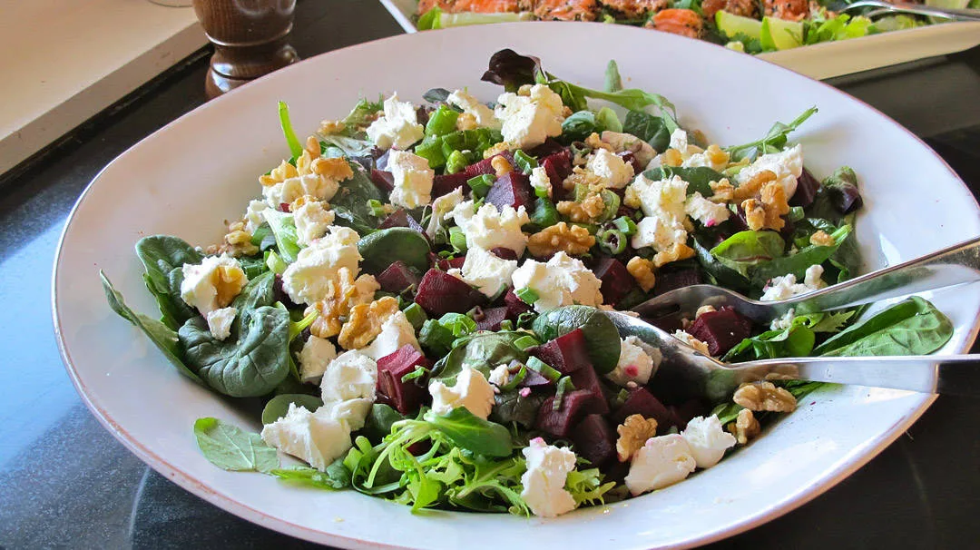 Herlig salat med ost, valnøtter, spinat og rødbeter