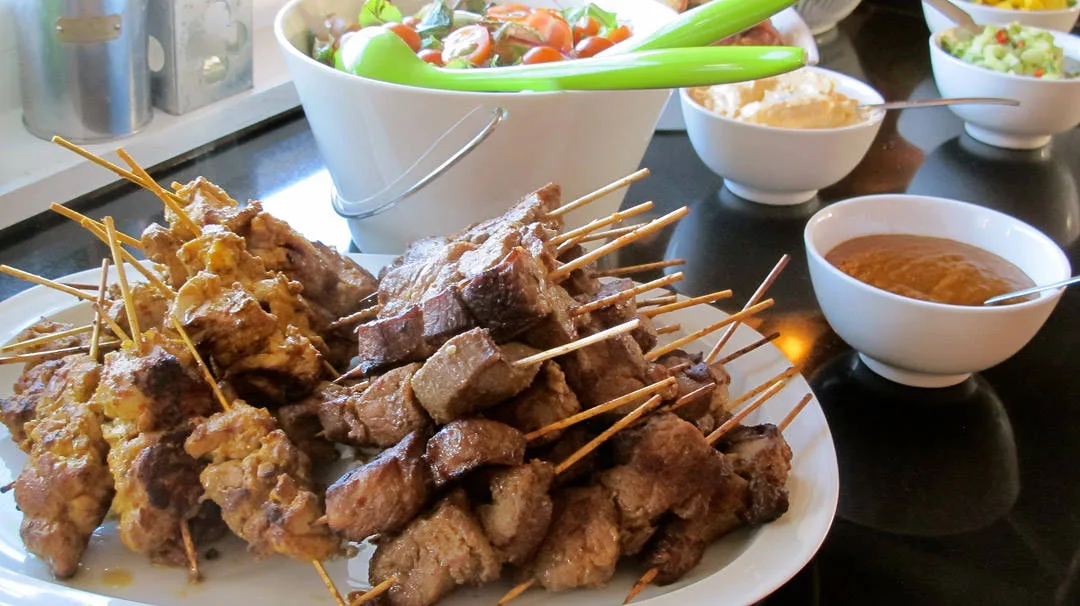 Satay med peanøttsaus. Torhild bruker kyllinglår og svinenakke for et maksimalt saftig resultat.